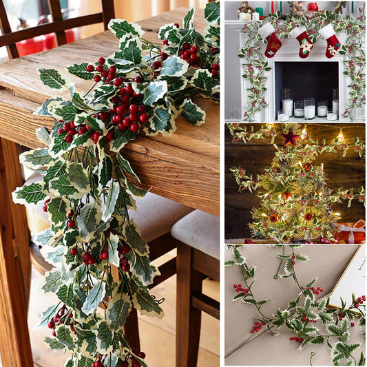 2M Christmas Garland Holly Leaf Red Berries Winter Fireplace Hanging Party Decor