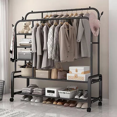 Heavy Duty Double Clothes Rail Rack Garment Hanging Stand Shoes Storage Shelves