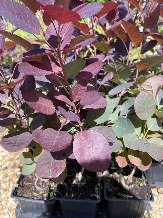 SINGLE COTINUS SMOKE BUSH ROYAL PURPLE PLANT 9CM POT SHRUB PURPLE FOLIAGE PINK FLOWERS