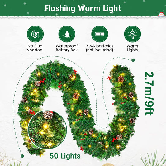 2.7M/9FT Christmas Garland with LED Lights and Pine Cones Berries
