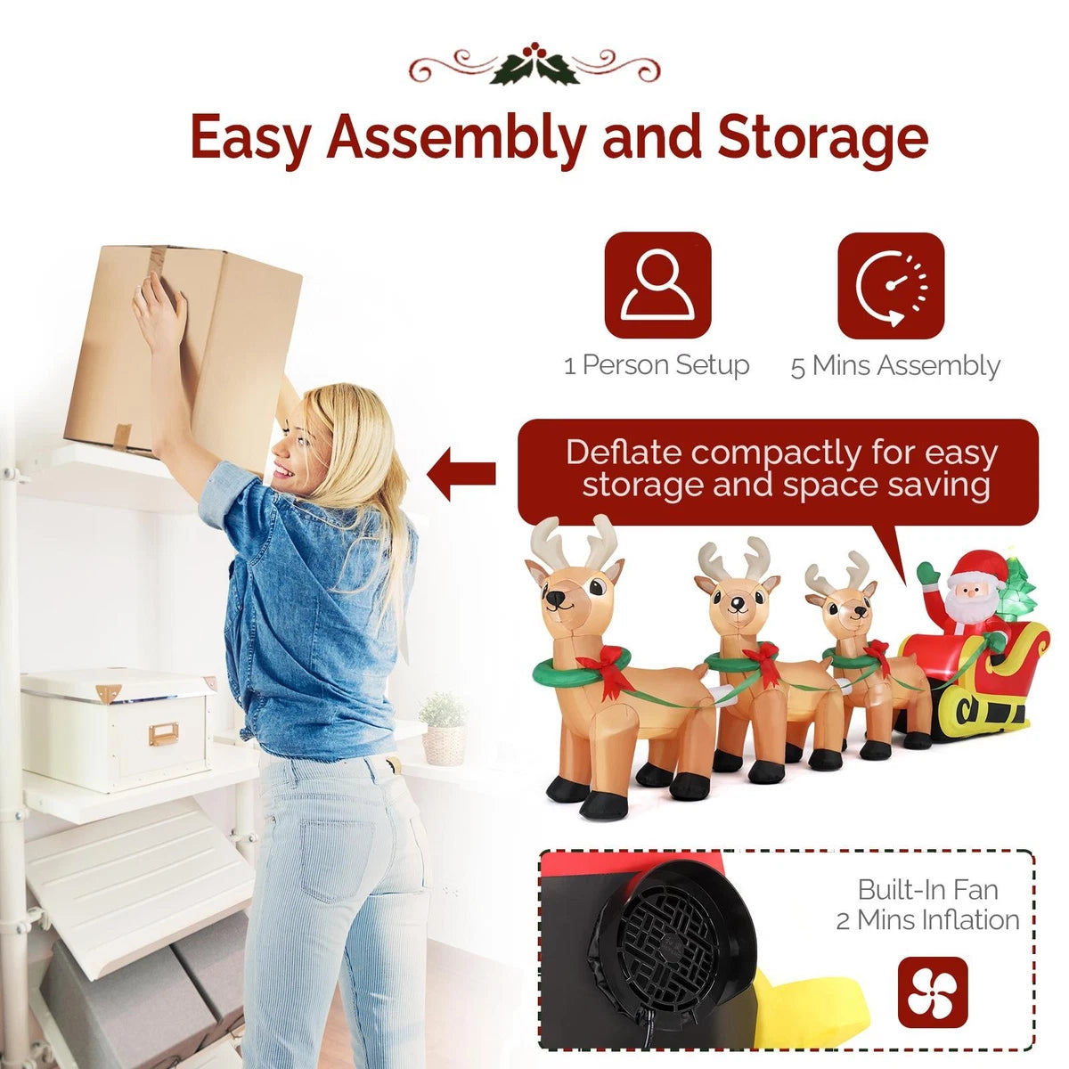 【Easy Assembly and Storage】Simply unfold the inflatable, close the zipper on the bottom, and then plug it into power outlet. With built-in large electric blower fan, the lighted Christmas inflatables can be simply assembled in 5 mins. It also can be fast deflated by opening the zipper on the bottom and packed back to store in garages or cabinets for space saving.