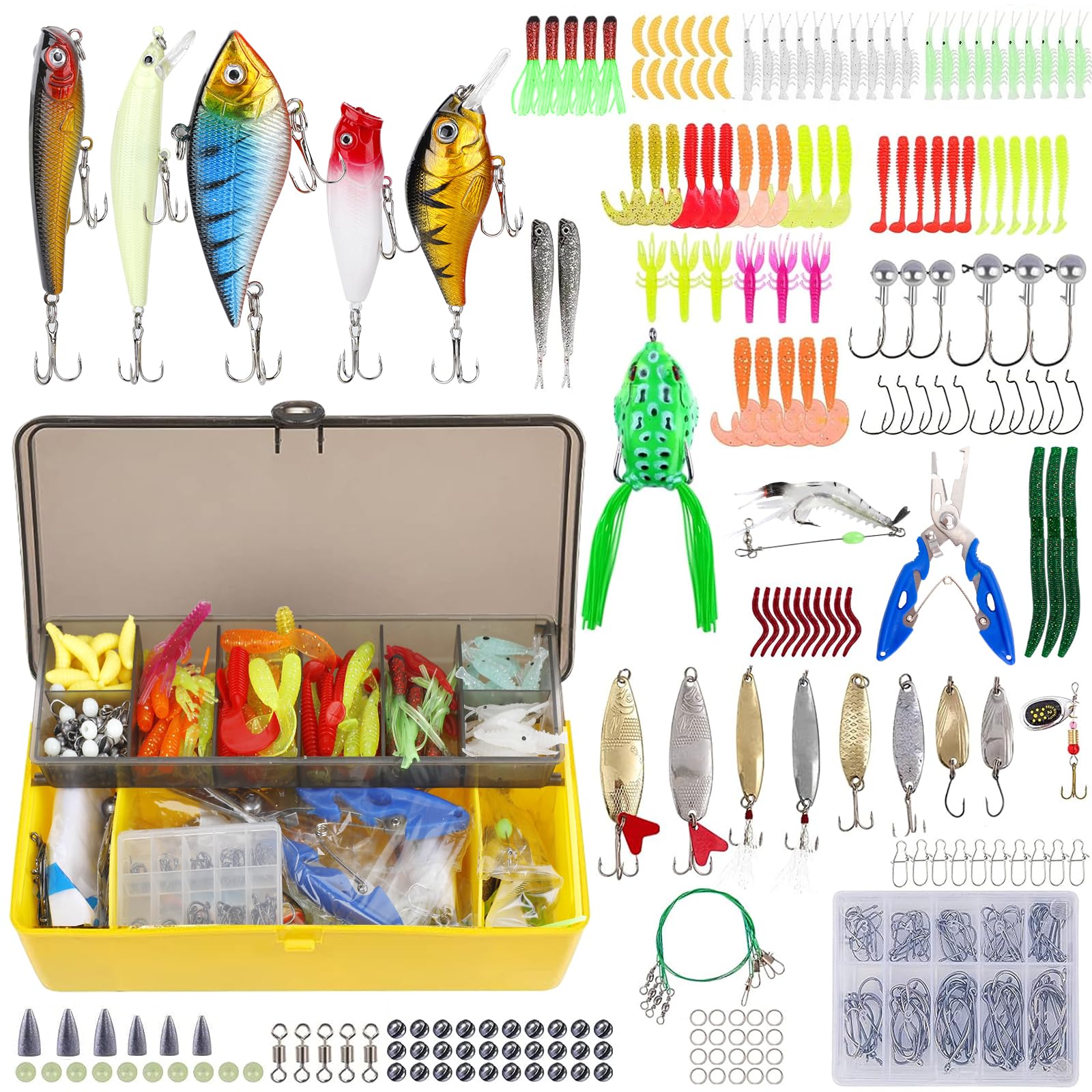 🐟【301 Variety of Size Fishing Lures combinations】- Crayon X 1/Minnow X 1/Popper X 1/Crankbait X 1/VIBE X 1/Fishing SpoonsX 8/ Spinners X 1/Curved Tail Grubs: 3. 5cm X 5 / 5cm X 12/Paddle Tail Swimbaits X 9/Frog Lures X 1/Prawn Lures X 1 /BIGTAIL Worms X 3 /Tube Lures X 5 /Split Tail Fishes X 2 /Earthworm X 10 /Shrimp X 6 /Shrimp X 20 /Maggot baits X 12 /Rolling Swlvels X 5/Duo Lock Snaps X 10 /Split Rings X 20/Removable Split Shot X 30 /Fishing Beads X 10/Off Set Hooks X 10/Jig Head X 6/Bullet Lead Sinkers X 6/Fishing HooksTackle Box X 100 /Wire Fishing Leaders X 2/PLIERS X 1,