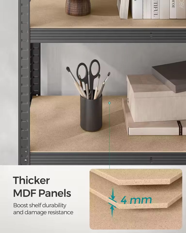 Specifications: Steel Frame, MDF (Medium Density Fibreboard) Product Size: 60 x 120 x 200 cm (D x W x H) Product Weight: 16.8 kg Max. Static Load Capacity per Tier: 120 kg Max. Static Load Capacity Total: 600 kg Package Contents: 1 x Shelving Unit 1 x Anti-Tip Kit 1 x Instructions Notes: Secure the shelving unit to the wall with the included anti-tip kit before use. Always wear work gloves during assembly. The shelving unit is not suitable for highly humid environments. All load capacities mentioned refer to the static load capacity.
