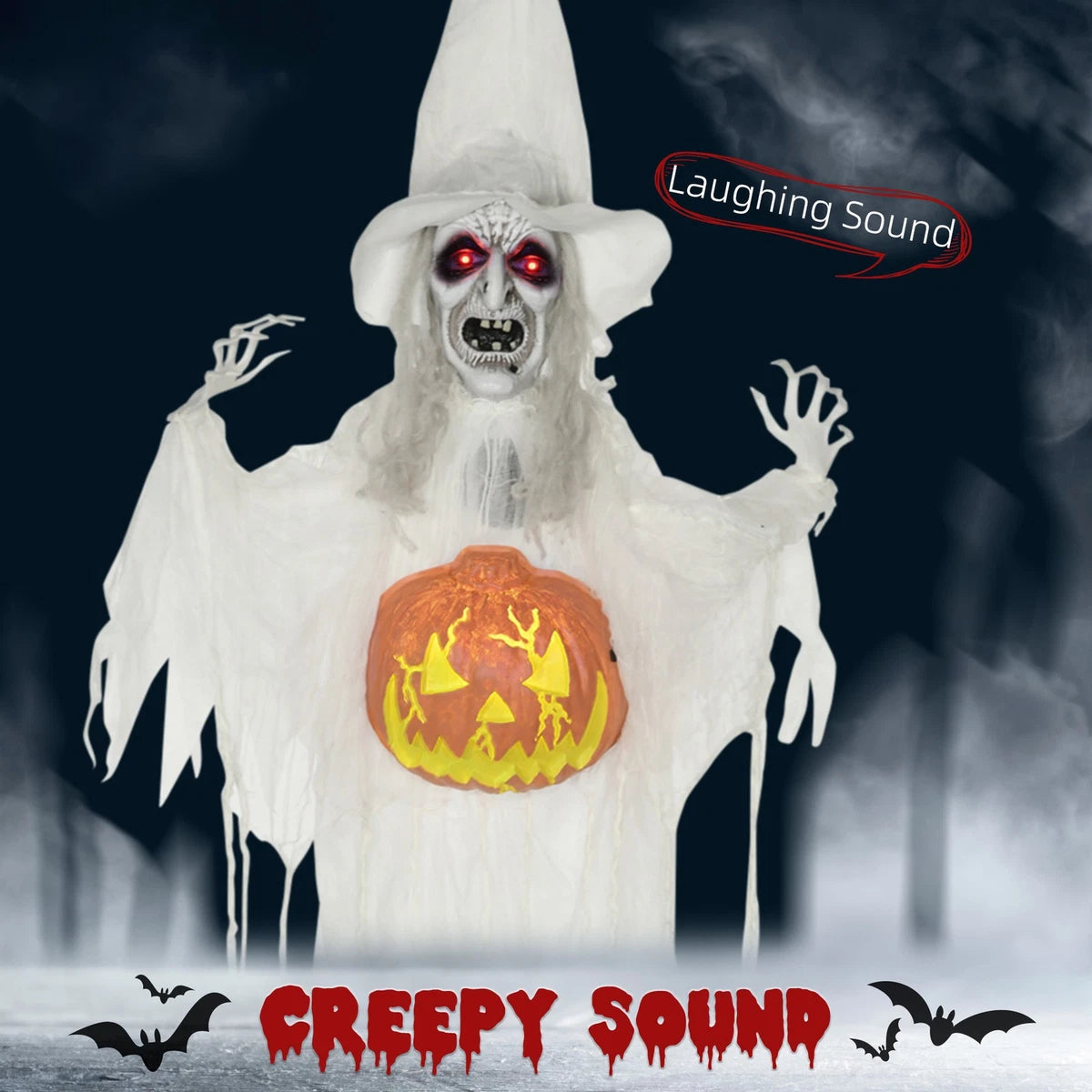 - • Outdoor Halloween animatronics: When she senses the trick-or-treaters, she stares into their souls with ghastly red glowing light and makes a creepy laughing sound, while her magical pumpkin blinks a warm yellow light.
