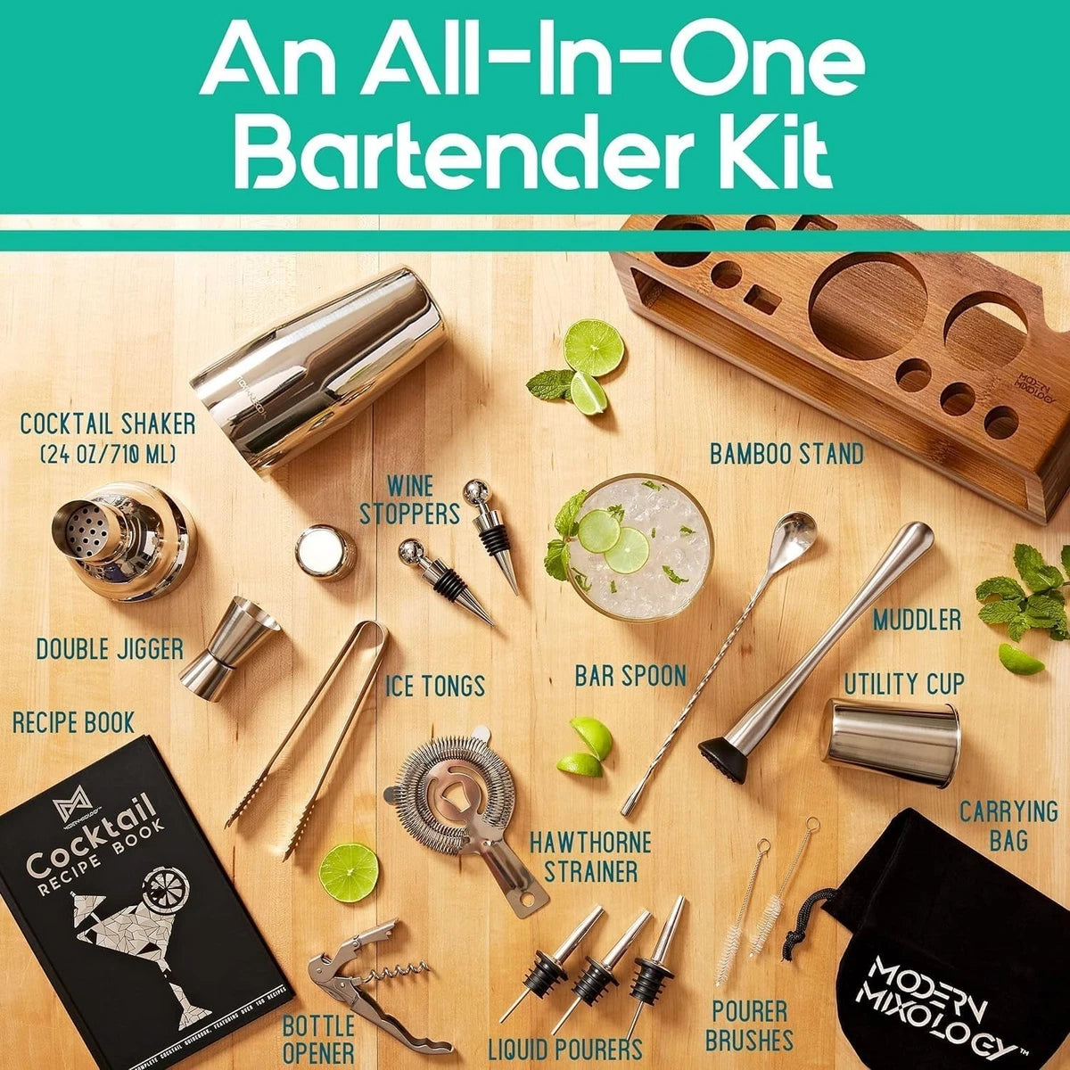 - VERSATILE: The 23-piece drink mixer set has all the bar tools you need to concoct a cocktail: a 24 oz Martini shaker set, jigger with markings, mojito muddler, Hawthorne strainer, bamboo stand and more.