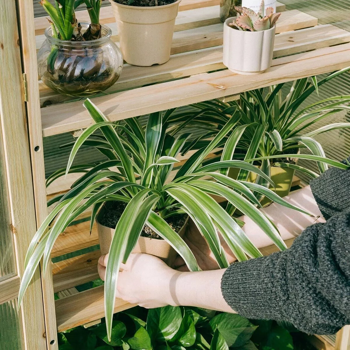 This wooden greenhouse willbring the vitality and the vigor to your home! Made of premium fir wood with outdoor painting and transparent polycarbonate glazing boards, This portable wooden greenhouse can bear the weight of a great amount of plants and help preserve the heat inside. Besides, the upper openable top and 2 doors make it convenient for you to move your plants as well as ensure the air circulation in the greenhouse. You will also get a wonderful visual experience for its plain and natural design!