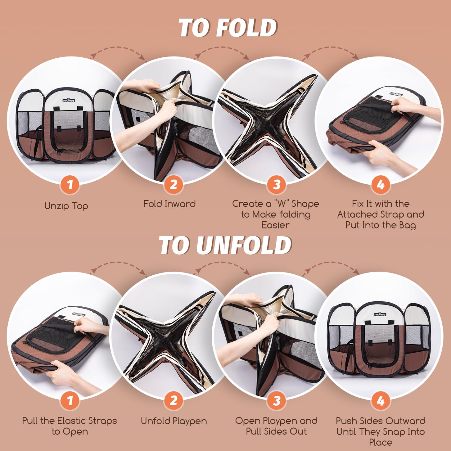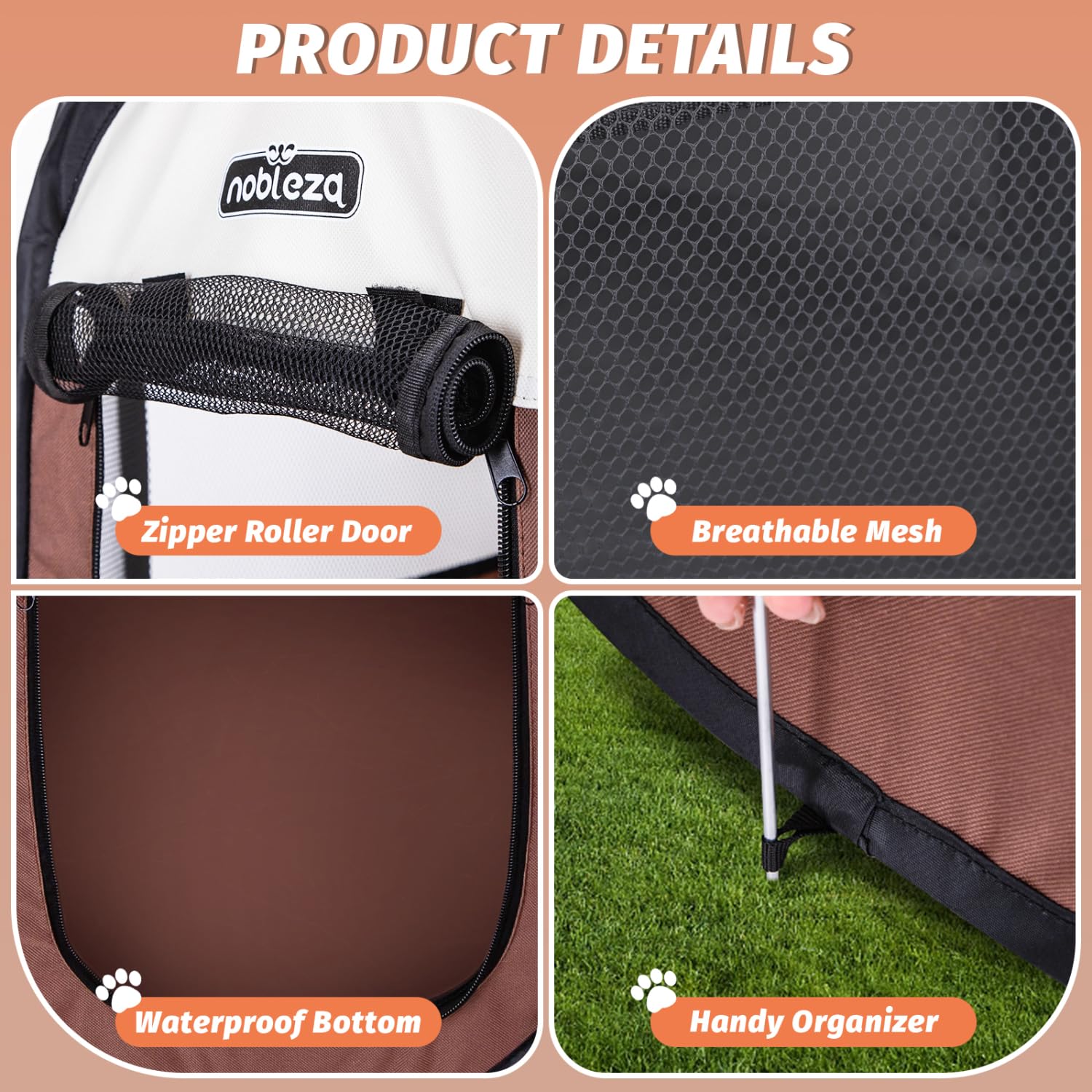 BREATHABLE: Nobleza dog playpen consists of breathable mesh and waterproof oxford fabric, with a spacious interior to provide space for your pet to play or sleep. Nobleza dog playpen comes with 8 mesh windows to provide good visibility. The removable zippered top cover can be easily removed for indoor use and closed for outdoor use to provide shade. Side roll-up door with zipper and magic tape provides easy in and out access for your pet. Close the door to keep your pet safe inside.