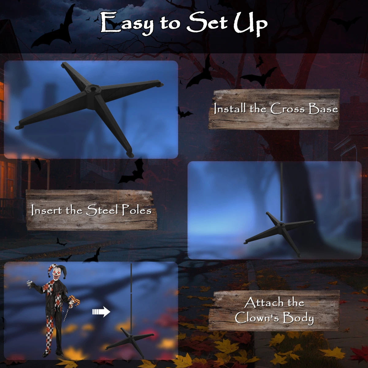 Life-size realism: Standing 183 cm tall, this animated Halloween prop wears a black outfit with pumpkin and checkered patterns, dons a long jester hat and holds a skull-topped staff—an eerie addition to your Halloween scary decorations