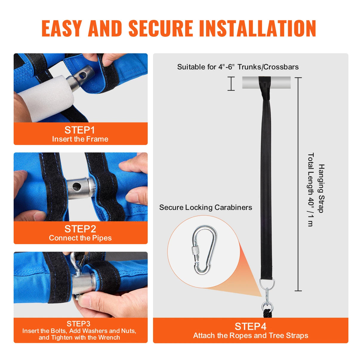 900D Blue Oxford Fabric: The blue swing seat is made of 900D high-density nylon fabric. This durable material is strong and can withstand everyday use and outdoor wear and tear, offering a long lifespan without fading. The frame tubes are made of galvanized steel with a soft foam layer, ensuring comfort and safety for children. The saucer swing seat is secured with four evenly stressed galvanized steel bolts that resist rust and keep the swing stable.